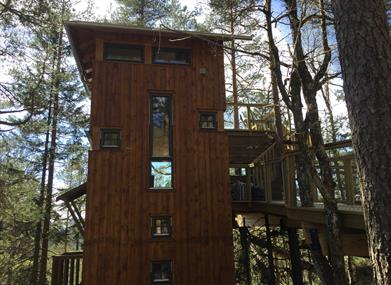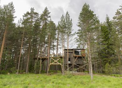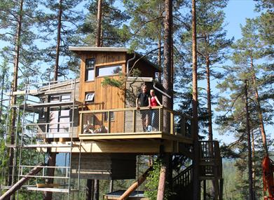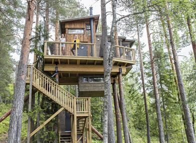 Denne trehytta er en ”hybrid” der selve hytta er fundamentert på bakken, mens terrassen svever i trærne. Hytta har soveplass til åtte personer, fullt innredet kjøkken med oppvaskmaskin, dusj og toalett. Hytta har tre etasjer; bad i første etasje, soverom i andre etasje og kjøkken og stue i tredje etasje. I tredje etasje kan du også fyre med ved. Utenfor er det bygget en Tarzanløype som er gøy for både små og store barn. Du finner også en snekkerbod i kjent Emil-stil, samt badeplass og mulighet for å bruke robåt.