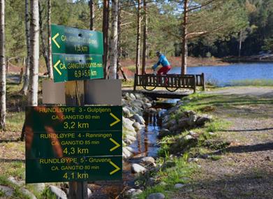 Her finner du seks merkede rundløyper i variert terreng, fra enkle turer på rundt 30 minutter til lengre ruter på opptil to timer. Rundt vannet ved stua går det en gruset vei som passer for både barnevogner og rullestoler.