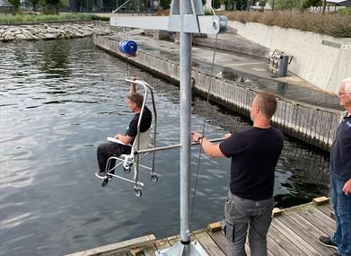 Her finner du en elektrisk HC-heis som kan brukes som badestol slik at du kan ta deg et avkjølende bad i havet i sommer. De kan også hjelpe deg ombord i båt med heisen. Det er bare å ta kontakt på telefon +47 401 03 261. Tilbudet er gratis!