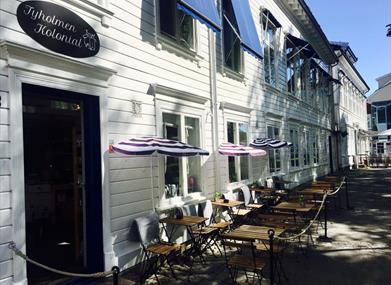 Om sommeren er det kjempekoselig å nyte en god kaffe eller en smakfull vin med noe godt å bite i ved siden av på deres uteservering på Teaterplassen.
