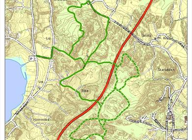 Med utgangspunkt Hauslandstjenna får man en lang tur via lysløypa. Løypa starter langs Hauslandstjenna. Her er det mulighet for å raste. Benkene er laget av lokal granittstein. Om sommeren er det bademuligheter her. Litt lenger inni marka deler løypa seg. Her lå den tidligere Tjennheia hoppbakke. Restene sees på venstre side av turveien. Fortsett rett fram i løypa til du kommer til Rosenlunde som er et lite rødt hus. Herfra tar man til venstre på turveien under E18 forbi Ribegården mot Lia.