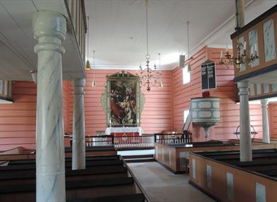 Kyrkja er ei krosskyrkje. På båe langsidene er det to store trev (galleri), der ungdomane sat, gutane på høgre sida og jentene på venstre. Slik var det i kyrkjebenkene også, mennene på høgre sida og kvinnene på venstre. På kyrkjetårnet er det ein verhane, og under den er det forma eit hjarta som ein kan sjå frå alle fire sidene. I tårnet er det måla på eit tårnur.