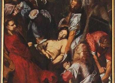 Johannes, Josef frå Arimatea og Nikodemus har kome til grava som er hogget inn i fjellet på høgre side av biletet. Maria Magdalena kneler ned i tilbeding, medan Maria og kvinnene rundt henne har trekt seg tilbake i sorg og fortviling. I bakgrunnen ser vi Golgata, ein borg og Jerusalem.