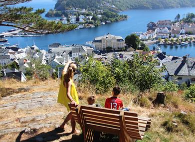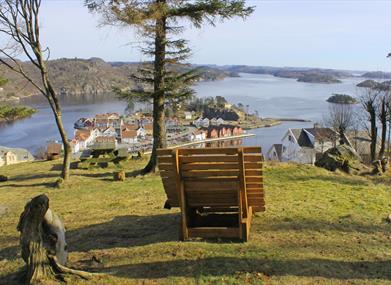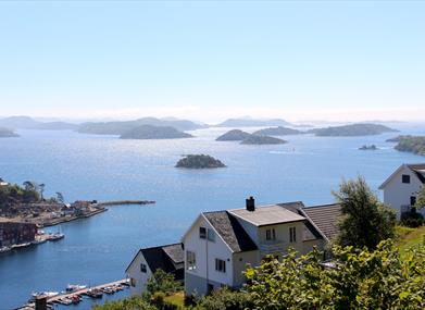 Du ser den flotte marinaen, fjellene og de gamle husene. Du kan se hele veien til Lindesnes fyr, som ligger 20 kilometer borte.